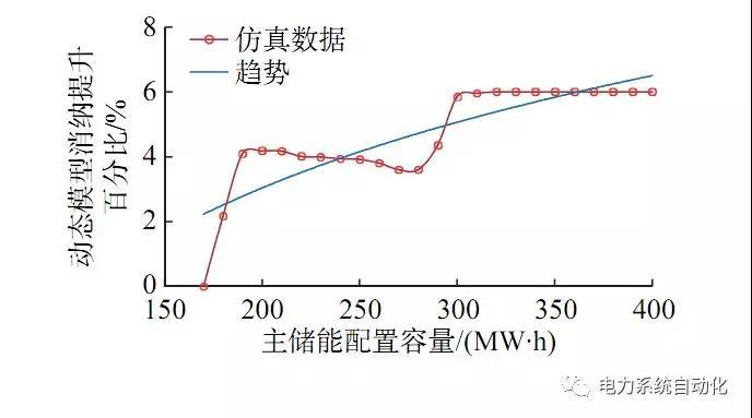 假設(shè)主儲能的容量在170MW·h~400MW·h之間變化,得到單一儲能模式下消納提升效果與儲能容量的關(guān)系曲線如圖6所示(放電時段均為最大效率)??梢园l(fā)現(xiàn),消納提升效果的百分比總趨勢隨容量增加而增加;當(dāng)容量增加到一定水平后,改善效果趨于飽和,不再增加。通過這組曲線,也可以為風(fēng)儲聯(lián)合系統(tǒng)的儲能優(yōu)化配置提供借鑒。