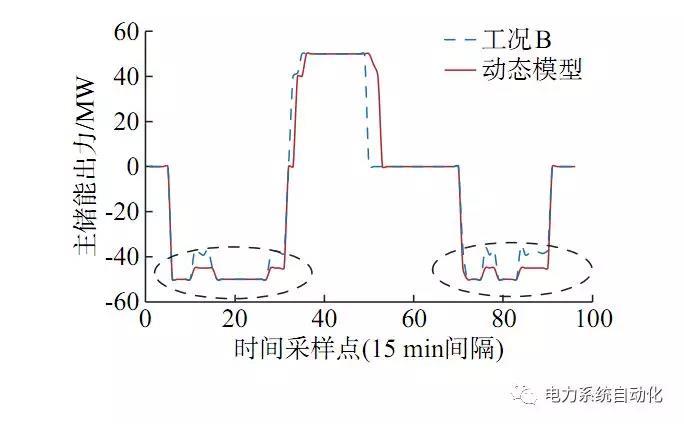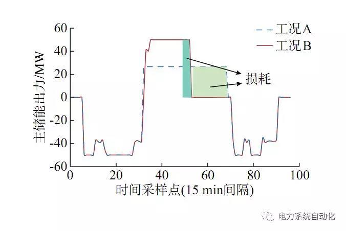 在動態(tài)效率模型下,其特性是放電功率小對應(yīng)效率低,放電功率大對應(yīng)效率高,因此,不同放電功率下的等效消納電量不同,放電功率越低則消納電量越小,放電過程中損失的能量越大。圖3給出了主儲能放電時段的A、B兩種極限情況,B以最大功率即對應(yīng)最高效率放電,可釋放能量的等效消納電量最大;而A的放電功率及對應(yīng)效率最低,更多的能量被損耗,等效消納電量最小,B工況即為考慮動態(tài)效率模型下的最優(yōu)結(jié)果。常數(shù)、動態(tài)模型的消納效果最大差異值即為A、B工況的差值,相對差值為34.74%,一般常數(shù)效率取效率曲線的平均值,其消納差異會小一些。