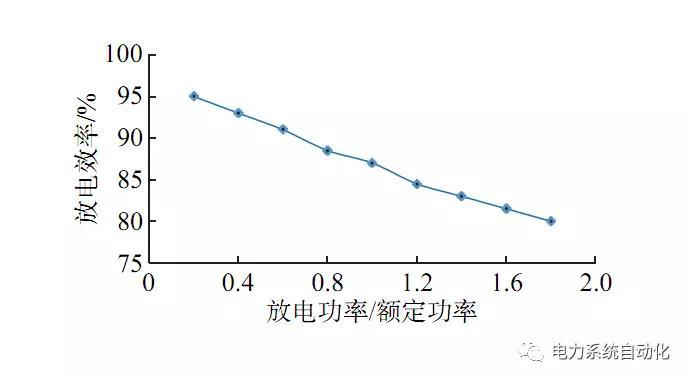 電化學(xué)儲能的效率特性與壓縮空氣儲能完全不同。以放電環(huán)節(jié)為例,鉛酸電池和鋰電池儲能在合理放電深度范圍(典型值SOC在20%~95%區(qū)間),電壓基本不變,效率隨著放電電流的增大有不同程度的降低。依據(jù)鋰電池放電深度與電壓的關(guān)系、放電效率與電流的關(guān)系得到鋰電池放電效率變化特性,有著“下降型”特征,且近似線性。