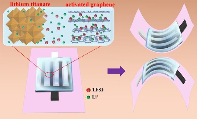 最近,該研究團(tuán)隊(duì)在國(guó)際上率先開發(fā)出一種新概念的全固態(tài)柔性平面鋰離子微型電容器。該微型電容器以高導(dǎo)電石墨烯為集流體,以高電壓離子凝膠作為電解質(zhì),以納米鈦酸鋰為負(fù)極和活化石墨烯為正極構(gòu)筑出高離子電子傳導(dǎo)的平面交叉指型微電極,進(jìn)而在一個(gè)基底上組裝出全固態(tài)鋰離子微型電容器。該鋰離子微型電容器具有高能量密度53.5mWh/cm3,高于目前報(bào)道的鋰薄膜電池和微型超級(jí)電容器。同時(shí),該鋰離子微型電容器具有優(yōu)異的循環(huán)穩(wěn)定性,6000次循環(huán)后電容保持率為98.9%;具有高溫電化學(xué)穩(wěn)定性,能在80°C條件下穩(wěn)定工作;以及具有優(yōu)異的機(jī)械柔性,在各種彎曲和扭曲狀態(tài)下達(dá)到性能基本沒有衰減。此外,該鋰離子微型電容器表現(xiàn)出良好的模塊化集成能力,無需金屬連接體,可有效調(diào)控輸出的工作電壓和容量。因此,該工作為開發(fā)柔性化、小型化、智能化儲(chǔ)能器件提供了新的策略。