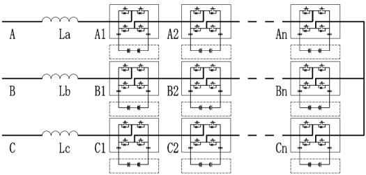 智光儲能推出的高壓直掛儲能系統(tǒng),由電池組與單相PCS模塊構(gòu)成的儲能單元(H-Cell,如上圖A1)組成,利用電壓疊加原理實現(xiàn)高壓直接輸出。H-Cell電池組直流電經(jīng)單相PCS轉(zhuǎn)換成幾百伏的交流電;多個硬件結(jié)構(gòu)完全一致的單相PCS交流側(cè)串聯(lián)構(gòu)成單相高壓儲能裝置,產(chǎn)生與電網(wǎng)電壓匹配的單相高壓交流電;三組硬件結(jié)構(gòu)完全一致的單相高壓儲能裝置Y接構(gòu)成三相高壓儲能裝置,即直接輸出與電網(wǎng)電壓匹配的三相對稱高壓交流電。