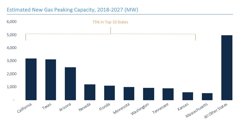 假設(shè)新容量遵循與現(xiàn)有容量相似的運(yùn)行時(shí)間,那么可以預(yù)測(cè),4小時(shí)電池儲(chǔ)能系統(tǒng)與平均運(yùn)行時(shí)間少于4小時(shí)的天然氣發(fā)電廠運(yùn)行時(shí)間相比更具成本效益。這相當(dāng)于6.4吉瓦,占未來(lái)10年峰值容量的32%,而這些大部分市場(chǎng)機(jī)會(huì)將出現(xiàn)在加利福尼亞州、德克薩斯州和亞利桑那州。