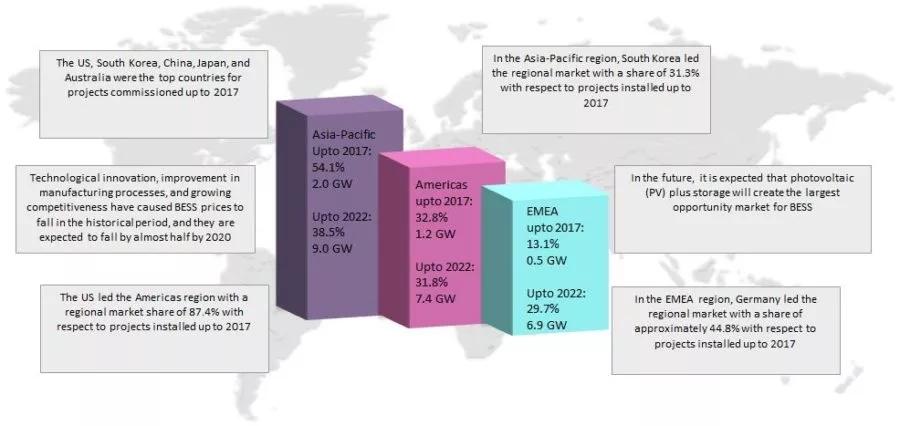 其他市場(chǎng)區(qū)域,例如非洲,中東和拉丁美洲等,僅有很少的實(shí)際存在的電池儲(chǔ)能項(xiàng)目。據(jù)預(yù)測(cè),全球范圍內(nèi)各國(guó)可再生能源的迅速普及,將有助于刺激儲(chǔ)能的應(yīng)用。未來光伏加儲(chǔ)能可能會(huì)為電池儲(chǔ)能系統(tǒng)創(chuàng)造最大的市場(chǎng)機(jī)會(huì)。