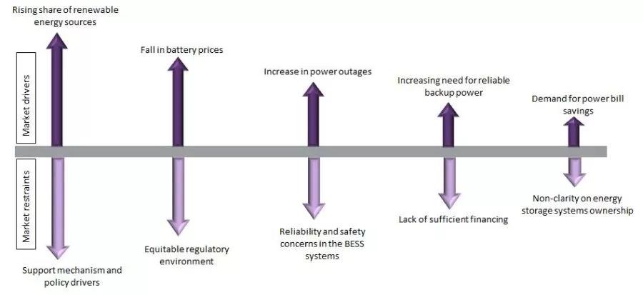 另一方面,電池儲(chǔ)能系統(tǒng)市場(chǎng)正面臨幾項(xiàng)挑戰(zhàn)。例如,合理監(jiān)管環(huán)境的缺失延緩了電池儲(chǔ)能系統(tǒng)項(xiàng)目的發(fā)展。電池儲(chǔ)能系統(tǒng)市場(chǎng)決定于于體制監(jiān)管障礙減少以及公私部門合作的鼓勵(lì)政策。目前沒有儲(chǔ)能設(shè)備通用的標(biāo)準(zhǔn)文件,因此每個(gè)制造商都可以自由開發(fā)各自的內(nèi)部標(biāo)準(zhǔn),這導(dǎo)致系統(tǒng)在安裝和維護(hù)過程中存在兼容性問題。使用這種在不同公司技術(shù)和制造水平生產(chǎn)的唯一或者定制的備用件,會(huì)造成延緩整個(gè)工業(yè)經(jīng)濟(jì)規(guī)模的影響。應(yīng)制定可促進(jìn)儲(chǔ)能技術(shù)的國(guó)家標(biāo)準(zhǔn),以加強(qiáng)儲(chǔ)能滲透。這也有利于國(guó)家電力提高穩(wěn)定性和可靠性的解決方案。同時(shí),電池儲(chǔ)能系統(tǒng)的可靠性和安全性問題、缺乏足夠資金、支持機(jī)制和政策驅(qū)動(dòng)的缺失、以及儲(chǔ)能系統(tǒng)所有權(quán)的不明晰,都將是未來一段時(shí)間內(nèi)阻礙電池儲(chǔ)能系統(tǒng)快速增長(zhǎng)的一些因素。
