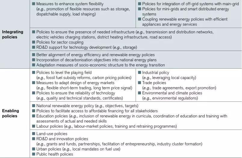 實現(xiàn)能源轉(zhuǎn)型,需要的不僅僅是針對能源部門制定的政策更為全面。能源領(lǐng)域的迅速變化需要一種新的政策分類方式,這涉及到能源系統(tǒng)的轉(zhuǎn)變和它賴以生存的社會經(jīng)濟(jì)結(jié)構(gòu)的轉(zhuǎn)變。這期間的政策需要采取綜合辦法,兼顧這兩個方面。隨著可再生能源從利基轉(zhuǎn)向主流,推動轉(zhuǎn)型的政策不僅必須涵蓋可再生能源的部署,還必須納入影響可持續(xù)性和轉(zhuǎn)型速度的更廣泛的能源系統(tǒng)和經(jīng)濟(jì)政策。