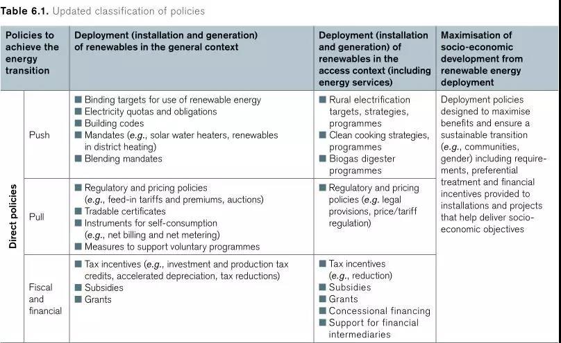 表6.1 提出了更新的可再生能源政策分類:直接政策文件,一體化政策,以及扶持政策。
