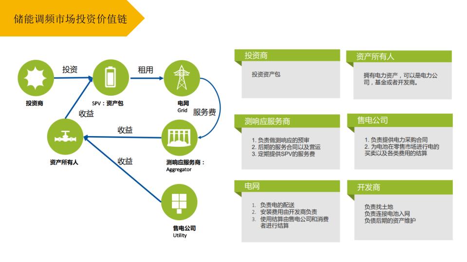 儲(chǔ)能在英國(guó)項(xiàng)目上投資的價(jià)值鏈跟大家也分享一下,因?yàn)槟壳吧轿鞯膸讉€(gè)調(diào)頻電廠,就是由火電廠和電網(wǎng)公司直接交易,在這個(gè)環(huán)節(jié)上偏單薄一點(diǎn)。我們?cè)谟?guó)有兩個(gè)角色非常關(guān)鍵。資產(chǎn)所有人就是我們的電站,電站直接跟電網(wǎng)公司交易,這是不被允許的。交易的時(shí)候是需要有兩個(gè)資質(zhì)的,拿不到這個(gè)資質(zhì)是沒(méi)有資格跟電網(wǎng)公司交易的。為什么這么設(shè)置?英國(guó)本身算是一個(gè)固網(wǎng)的電網(wǎng),因?yàn)樗且粋€(gè)島嶼,就設(shè)置了資產(chǎn)包的角色。另外還有一個(gè)關(guān)鍵的角色售電公司,咱們中國(guó)的售電已經(jīng)也有兩年的發(fā)展了,發(fā)展得也很迅速。儲(chǔ)能和售電怎么結(jié)合來(lái)參與電網(wǎng)的服務(wù)?在英國(guó)也是這樣去操作的。