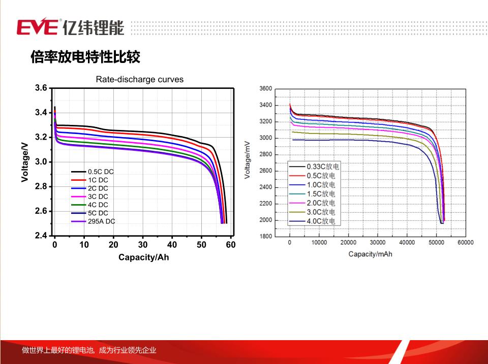 這幾條曲線大概是5.5c的功率情況,它的一致性趨勢還是比較趨同的。我們看一下對比。左邊的這條曲線是高倍率電芯,右邊曲線是普通的磷酸鐵鋰常用的電芯。我們細(xì)看一下這個曲線,以2C放電,2C現(xiàn)在基本在調(diào)峰調(diào)頻里大部分的配比都是2:1,調(diào)頻的指令時間段是相關(guān)的。2C本身的曲線,這邊是高倍率放電特性來講,藍(lán)色的曲線在整個放電的過程中,有很大一段電壓平臺仍然是在3.2V以上;一個常規(guī)電芯常規(guī)放電初期就已經(jīng)跌落到了2.3V以下,實際上它的倍率是不夠的。再看一下,到3C的時候,這條線已經(jīng)跌落到了3.1V以下,而且線本身的斜率是更加平緩的;這邊從高倍率的電芯來看,下降的趨勢雖然區(qū)間小,但是它的斜率相對來說還是比較大的。我們跟BMS的廠家去交流,還在溝通過程中,如果采用倍率性不高的電芯,與BMS管理的時候,電壓波動的平臺太窄,所以對于BMS在管理控制中難度是增加的。反過來講,現(xiàn)在BMS的成本要降本,這是一個矛盾。所以,如果說本身從電芯的角度來講,把高倍率提升之后,對于BMS設(shè)計上來講是可以做簡化的。與此同時,電芯的改進(jìn)不僅僅是電芯本身的高倍率性提升了,作為整個儲能系統(tǒng)三大部件最核心的一塊,它的性能提升是可以支撐我相關(guān)部件降本的進(jìn)一步的實現(xiàn)。