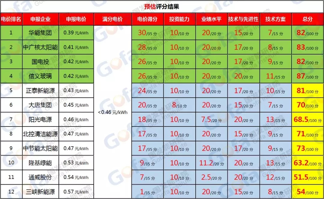 從項(xiàng)目4預(yù)估評分結(jié)果來看,信義玻璃、中廣核、華能、國電投等四家企業(yè)較有優(yōu)勢。其中“電價得分”并不占優(yōu)勢的制造型企業(yè)信義玻璃,將有可能通過技術(shù)先進(jìn)性與技術(shù)方案兩項(xiàng)得分戰(zhàn)勝此標(biāo)段最低電價華能集團(tuán)。