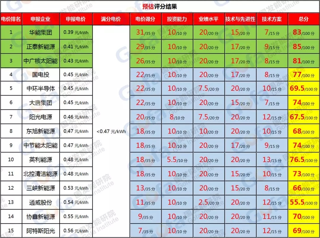 從項(xiàng)目5預(yù)估評分結(jié)果來看,正泰新能源、華能、中廣核等三家企業(yè)得分排名靠前。三家差別集中在“電價得分”、“技術(shù)方案”和“技術(shù)與先進(jìn)性”三方面,華能在電價方面占據(jù)絕對優(yōu)勢,但擁有制造產(chǎn)業(yè)的正泰新能源也不容小覷,誰能勝出或許將取決于有關(guān)方面對于技術(shù)方案的判定。