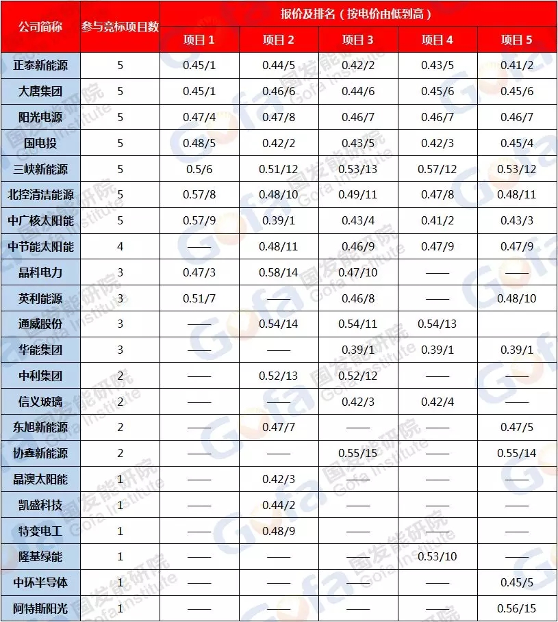 國發(fā)能研院、綠能智庫梳理發(fā)現(xiàn),此次共有22家企業(yè)分別競爭5個標(biāo)段的項(xiàng)目開發(fā)權(quán),其中有7家企業(yè)參與了所有標(biāo)段的競標(biāo),分別是正泰新能源、大唐集團(tuán)、中廣核太陽能、三峽新能源、國電投、北控清潔能源、陽光電源。其中正泰新能源五個標(biāo)段的報價都比較低,排在最低電價的前五名以內(nèi),且在項(xiàng)目1是最低報價,項(xiàng)目3和項(xiàng)目5是次低報價。其次是中廣核太陽能,擁有1個最低報價和1個次低電價。