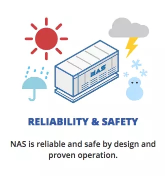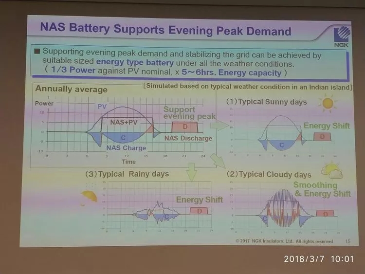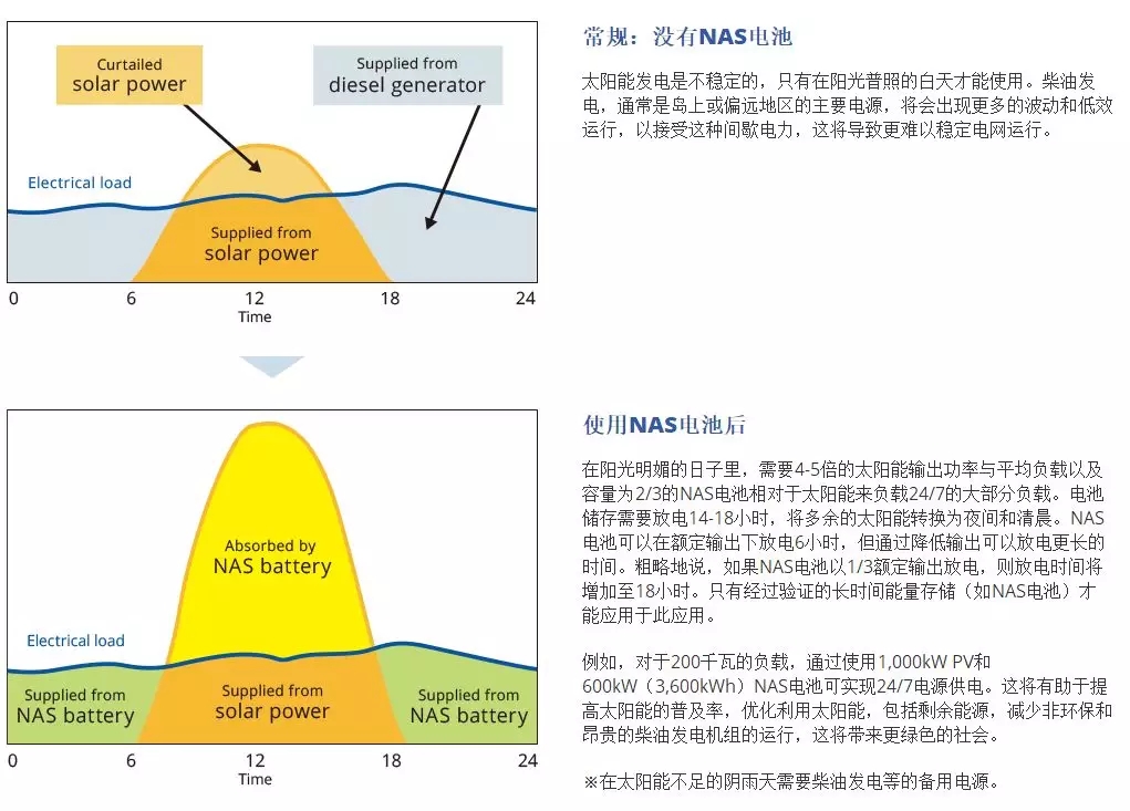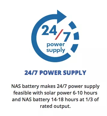 NAS電池可實現(xiàn)連續(xù)供電,用太陽能供電6-10小時,NAS電池以額定功率的三分之一供電14-18小時,額定輸出為1/3。