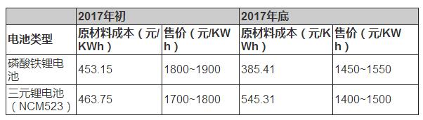 2017年底較年初,磷酸鐵鋰電池原材料成本從453.15元/KWh下降到了385.41元/KWh,降幅近15%;三元鋰電池原材料成本從463.75元/KWh上漲到了545.31元/KWh,漲幅達17.6%。