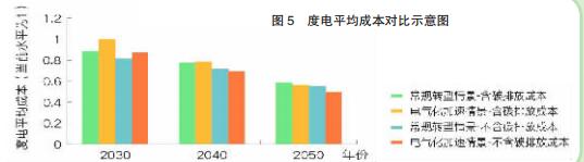 當前至2030年,電力需求保持較快增長,且新能源發(fā)電等新技術仍處于發(fā)展期,電力系統(tǒng)總成本持續(xù)上升。2030~2050年,電力需求增長逐漸趨于飽和,新能源發(fā)電等技術日益成熟,系統(tǒng)成本進入下降期,此階段能源發(fā)展的低碳性目標與經(jīng)濟性目標逐漸重合。相比于電力系統(tǒng)總成本,度電平均成本的達峰時間更早,預計2050年度電成本約為當前水平的一半左右。
