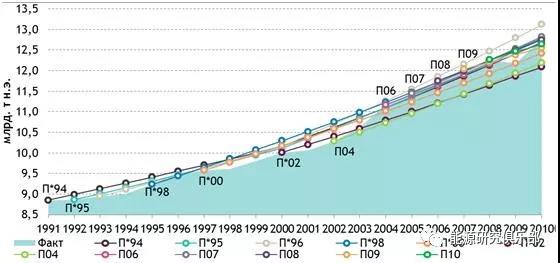上圖中,具體年份相對誤差的平均值為2.05億噸石油當量,或2%左右,最大值為6.76億噸石油當量,或不超過5%。如果不經(jīng)修正,上世紀90年代IEA的預測數(shù)據(jù)誤差會較大,這并不是IEA統(tǒng)計模型準確性的問題,而是一次能源消費統(tǒng)計核算的特點所致。