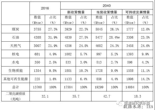 表2 IEA 2040年全球一次能源需求預測