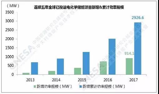 據(jù)中關村儲能產(chǎn)業(yè)技術聯(lián)盟(CNESA)項目庫的不完全統(tǒng)計,截至2017年底,全球已投運儲能項目累計裝機規(guī)模為175.4GW。其中,抽水蓄能的累計裝機占比最大,為96%,較上一年下降1個百分點。電化學儲能項目的累計功率規(guī)模為2926.6MW,占比1.7%,較上一年增長0.5個百分點。2017年,全球新增投運電化學儲能項目的功率規(guī)模為914.1MW,同比增速超過20%。