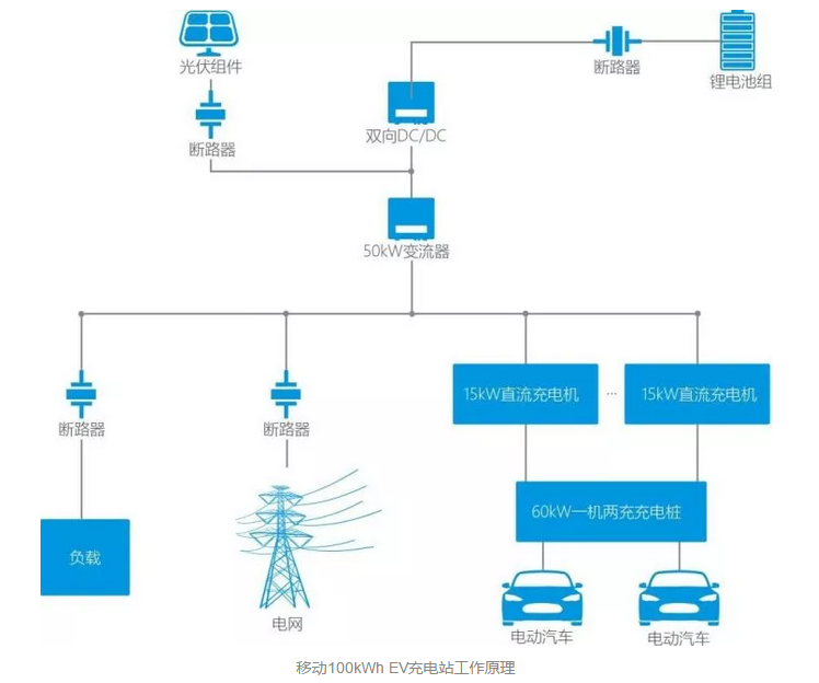 可利用光伏或市電充電,為電動汽車提供直流電源,也可作為工商業(yè)的應(yīng)急儲備電源使用。
