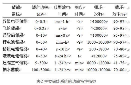目前,不同國家多采用給定時(shí)間尺度風(fēng)電功率最大波動量,作為風(fēng)電波動限制指標(biāo)。該指標(biāo)的時(shí)間尺度和波動幅值分別對儲能系統(tǒng)的功率特性和存儲容量提出了要求。因此,儲能系統(tǒng)的類型選取應(yīng)重點(diǎn)關(guān)注儲能系統(tǒng)的功率特性。表2給出了主要儲能系統(tǒng)的功率特性指標(biāo)。
