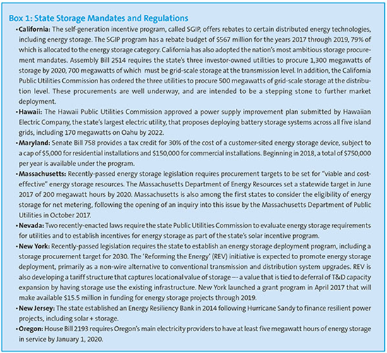 許多州政府已經(jīng)頒布或正在制定促進儲能的任務(wù)或條例(見圖1)。在短期內(nèi),各州可能會對儲能部署的發(fā)展負責,因為它們的規(guī)模較小,而且比聯(lián)邦政府在應(yīng)對市場狀況方面更靈活。一些州和地方政府對可再生能源的部署也比目前的美國聯(lián)邦政府更有興趣。例如,11個州和波多黎各和哥倫比亞特區(qū)市長州長承諾將繼續(xù)遵守巴黎氣候協(xié)議。