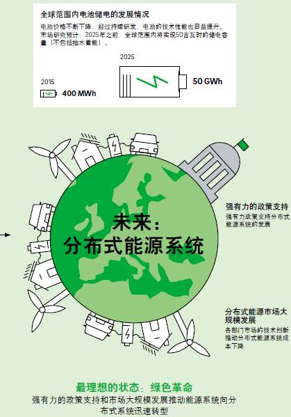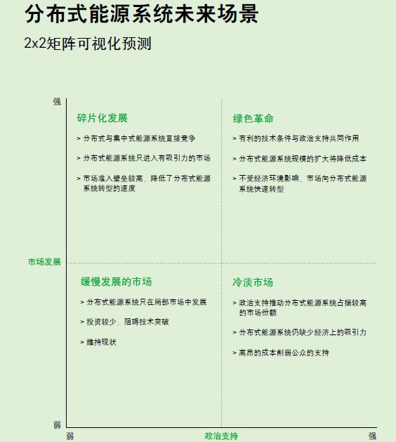 與“綠色革命”相比,在此情景中,分布式能源將以一種碎片化的模式發(fā)展,市場(chǎng)高度競(jìng)爭(zhēng)的產(chǎn)業(yè)部門可能將蓬勃發(fā)展。例如,在其他分布式能源系統(tǒng)發(fā)展面臨困難的情況下,電動(dòng)汽車產(chǎn)業(yè)卻可能迅速騰飛。但若無基本的政治支持,即使在高度規(guī)范的市場(chǎng)中,分布式能源系統(tǒng)的發(fā)展也將舉步維艱。