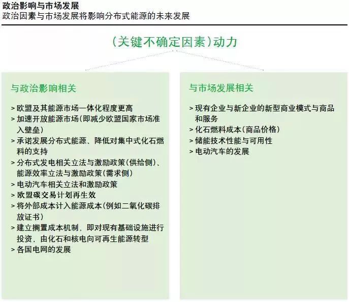 政策制定者決定分布式能源體系最終發(fā)展方向。美國(guó)近期的政策放松了對(duì)環(huán)保能源的要求,并推動(dòng)分布式/可再生能源的協(xié)調(diào)發(fā)展。歐洲政策制定者則著力于分布式能源系統(tǒng)的構(gòu)建。