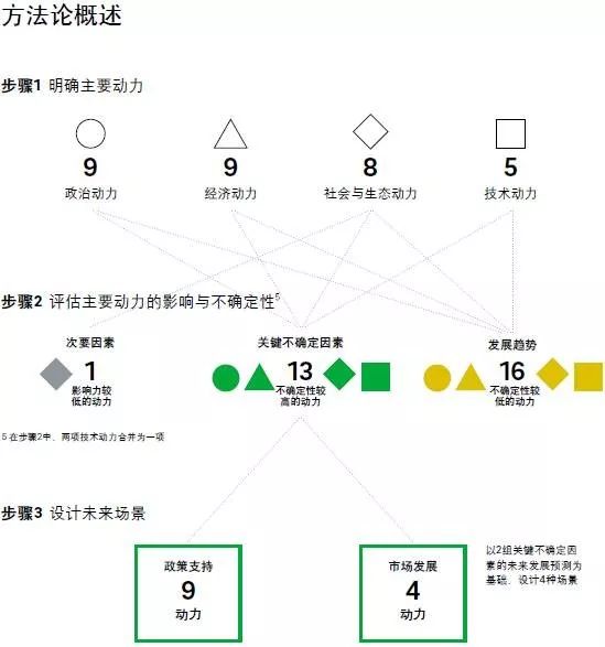 其中,“發(fā)展趨勢(shì)”是指影響程度較高、不確定性較低的因素,專家普遍認(rèn)同這些因素將對(duì)各利益相關(guān)方的未來發(fā)展產(chǎn)生影響?!瓣P(guān)鍵不確定因素”則包括可能對(duì)能源轉(zhuǎn)型產(chǎn)生重大影響的動(dòng)力因素,但這些因素的不確定性較高。