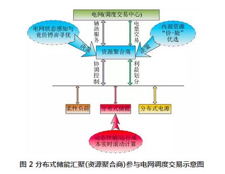 總體而言,已有研究大多針對集中式大容量的儲能系統(tǒng),而對于分布式儲能參與電網(wǎng)輔助服務(wù)的協(xié)同控制技術(shù)研究還較少。如何構(gòu)建規(guī)?;植际絻δ軈R聚效應(yīng)的動態(tài)仿真模型,協(xié)調(diào)控制多點布局的分布式儲能以及柔性負(fù)荷,亟需開展相關(guān)內(nèi)容的深入研究與應(yīng)用。有研究定義了負(fù)荷聚合商概念,因此進一步可以擴展到儲能參與需求響應(yīng)和提供輔助服務(wù)中,將會出現(xiàn)“資源聚合商”,未來資源聚合商將匯聚若干分布式用戶儲能參與電力市場交易,基本框架如圖 2 所示。