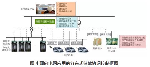 目前,國際上的分布式儲能協(xié)調(diào)控制設(shè)備研發(fā)也處在剛剛起步的過程,如德國能源供應(yīng)公司SENEC.IES,目前有 2000 個用戶參與到他們的Economic Grid計劃中,家庭用戶安裝“雙向能源管理系統(tǒng)”(簡稱 BEMI),每 15 min 儲存用戶用電數(shù)據(jù),記錄用戶用電習(xí)慣,當(dāng)電價發(fā)生變動時,BEMI 通過控制分布式儲能系統(tǒng)來調(diào)控用電時間和用電量。目前國內(nèi)尚沒有分布式儲能相關(guān)產(chǎn)品,主要是借用微網(wǎng)控制器實現(xiàn)類似功能,然而微網(wǎng)控制器多用于本地控制,很少涉及到廣域多點調(diào)度相關(guān)功能,同時微網(wǎng)控制器缺乏對電池儲能系統(tǒng)在線檢測、充放電優(yōu)化控制和保護的相關(guān)功能,難以實現(xiàn)對于分布式儲能系統(tǒng)的全面控制和優(yōu)化。伴隨配網(wǎng)側(cè)分布式儲能的快速發(fā)展,面向電網(wǎng)的儲能資源匯聚應(yīng)用將包含電池儲能設(shè)備、通過 V2G并網(wǎng)的電動汽車、儲熱鍋爐、冰蓄冷中央空調(diào)等分布式儲能設(shè)備,通過多設(shè)備間的協(xié)調(diào)控制,參與電網(wǎng)調(diào)峰、調(diào)頻等應(yīng)用,如圖4所示。在這個過程中,儲能系統(tǒng)的協(xié)調(diào)控制設(shè)備在上層調(diào)度和各分散的分布式儲能資源間起到調(diào)度指令分解、儲能設(shè)備協(xié)調(diào)控制、儲能監(jiān)控與保護、多應(yīng)用功能切換等功能。