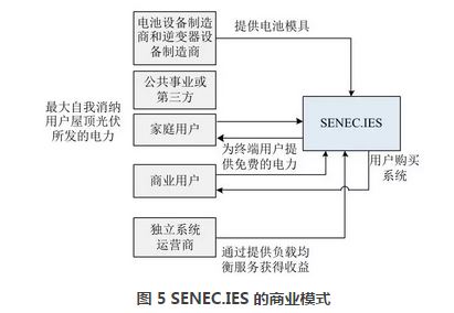 目前,與分布式光伏組合形成的分布式光儲系統(tǒng)在國外已有較多的商業(yè)應(yīng)用,在不同的國家,分布式光儲發(fā)電的應(yīng)用重點各不相同,美國加州在工商業(yè)領(lǐng)域的分布式項目居多,澳大利亞和德國市場的重點在戶用儲能領(lǐng)域。以德國 SENEC.IES 公司為例,該公司將用戶側(cè)儲能聚集起來開展“免費午餐”模式,享有對電池的主要控制權(quán),當(dāng)電網(wǎng)“零電價”時控制電池從電網(wǎng)充電。用戶主要通過最大化地自我消納屋頂光伏所發(fā)的電力、使用 SENEC.IES 提供給用戶的“免費儲存的電力”,實現(xiàn)更低的電費賬單,進而獲益。SENEC.IES 的商業(yè)模式見圖5。