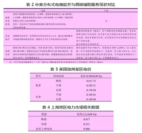 對分布式儲能的經(jīng)濟評價,需要量化儲能的投資運行費用、政策的補貼、工作模式如削峰填谷和配合新能源接入等帶來的收益以及節(jié)能減排等其它收益。由于新能源出力的不確定性,可以使用典型日提取、信息決策理論等方法對儲能帶來的收益進行量化評估,建立相應(yīng)的目標(biāo)函數(shù),評估儲能投資的可行性。分布式儲能參與系統(tǒng)調(diào)峰目前在美國已經(jīng)實現(xiàn)商業(yè)化運營,針對這一應(yīng)用模式就目前中美兩國的應(yīng)用現(xiàn)狀進行比較,如表 2 所示。