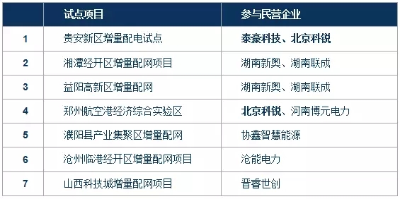 在國(guó)家電網(wǎng)經(jīng)營(yíng)區(qū)域內(nèi),也產(chǎn)生了首家非國(guó)網(wǎng)控股的增量配電網(wǎng)業(yè)務(wù)試點(diǎn)項(xiàng)目產(chǎn)生,該項(xiàng)目是山西科技城綜合能源供應(yīng)試點(diǎn)項(xiàng)目,由國(guó)家電網(wǎng)、管委會(huì)政府和社會(huì)資本共同成立,其中國(guó)家電網(wǎng)占股49%;民營(yíng)企業(yè)協(xié)鑫參與的三個(gè)增量配網(wǎng)項(xiàng)目(安徽金寨、河南濮陽(yáng)、江蘇揚(yáng)中)均與國(guó)家電網(wǎng)所屬公司合作。