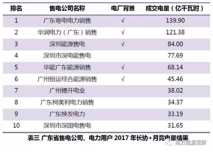 交易電量前十名的售電公司如表三所示,占總成交電量的60.79%,電廠(chǎng)背景售電公司占41.4%,排名第一的粵電占12.62%。