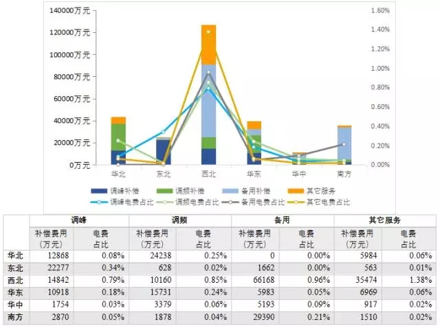 從分項(xiàng)電力輔助服務(wù)補(bǔ)償費(fèi)用來(lái)看,調(diào)峰、AGC和備用補(bǔ)償費(fèi)用占電力輔助服務(wù)補(bǔ)償總費(fèi)用的絕大部分比例,但各區(qū)域的補(bǔ)償費(fèi)用結(jié)構(gòu)也有自身明顯特征。