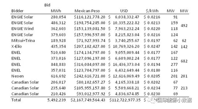 中國儲能網(wǎng)訊:墨西哥能源部2.3吉瓦/5.5TWh(55億度, 2020年入網(wǎng))光伏采購競標(biāo)結(jié)果日前出爐,意大利ENEL綠色電力公司報價1.77美分/千瓦時(相當(dāng)于人民幣0.11元/千瓦時),刷新不久前沙特阿拉伯1.79美分/千瓦時的光伏報價最低紀(jì)錄。在這次墨西哥的光伏項(xiàng)目競標(biāo)中,其他公司(也包括中國公司)的平均報價為2.05美分/千瓦時。