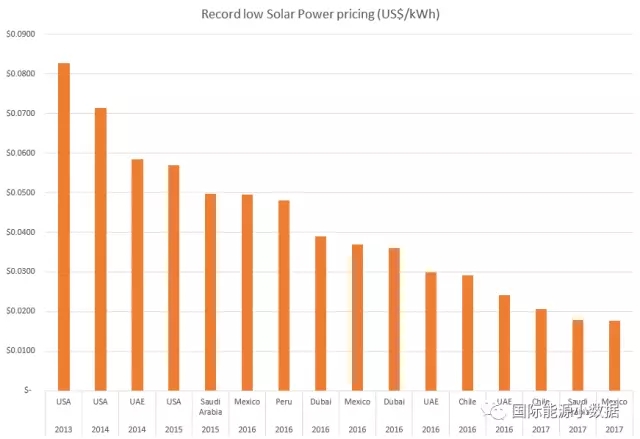 自從2013年美國光伏項(xiàng)目報出8.3美分/千瓦時的最低價格以來,光伏最低價不斷被刷新:2014年阿聯(lián)酋項(xiàng)目報4.97美分/千瓦時;2015年沙特項(xiàng)目報4.97美分/千瓦時;2016年在沙特再度報出2.42美分/千瓦時。到目前為止,2017年在全世界各地的光伏競標(biāo)中已經(jīng)有7個項(xiàng)目的報價低于2016年的最低報價。有國際專家預(yù)計(jì),按目前光伏成本趨勢,2019年光伏最低報價可低至1美分/千瓦時。