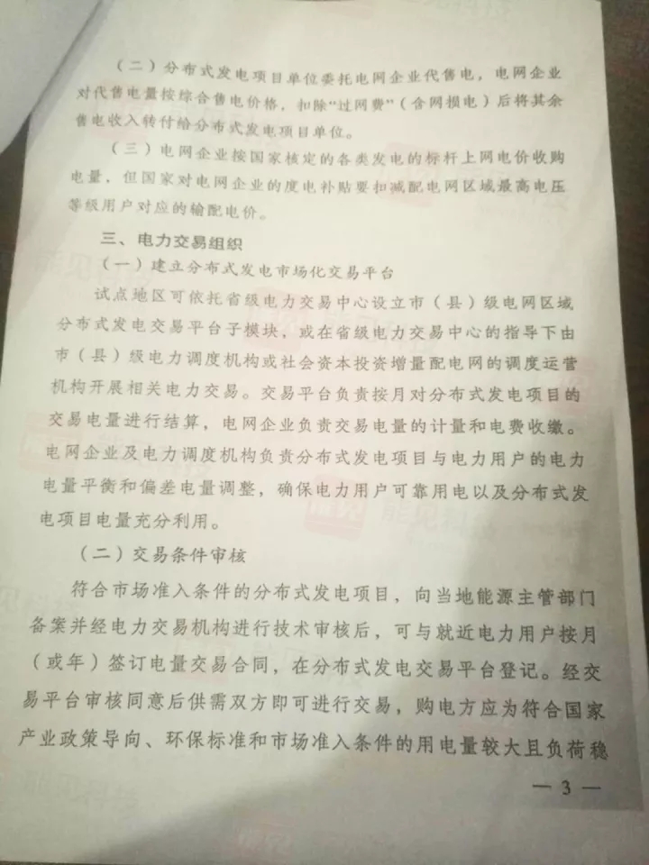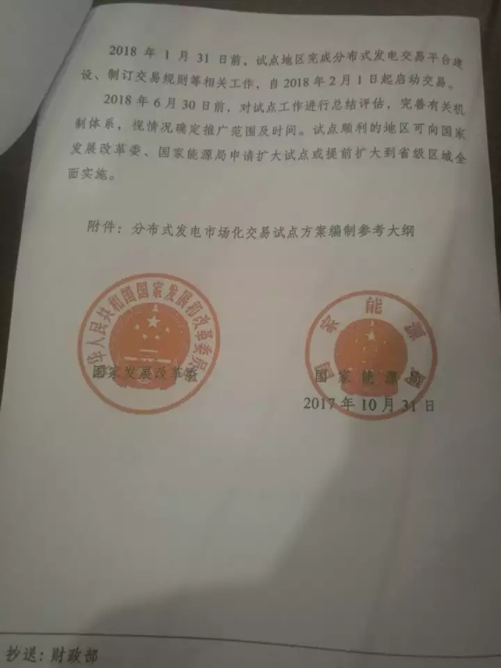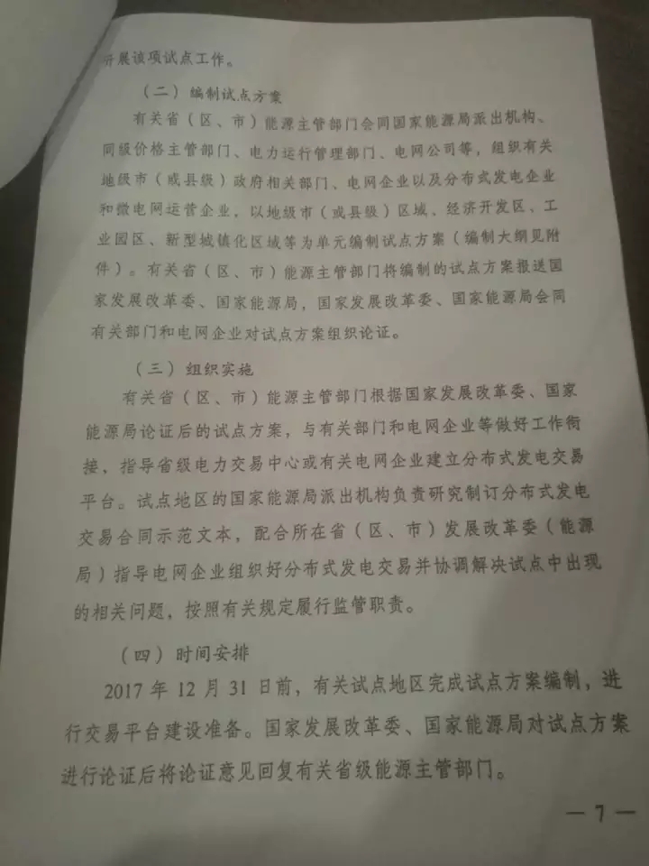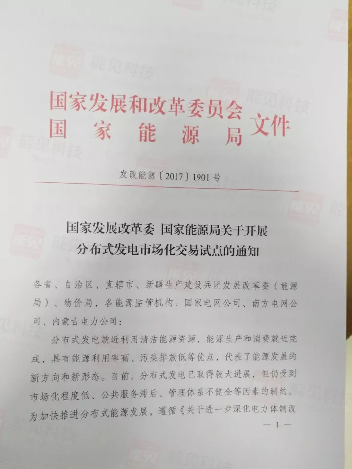 以下是國家發(fā)改委和國家能源局聯(lián)合發(fā)布《關(guān)于開展分布式發(fā)電市場化交易試點(diǎn)的通知》(發(fā)改能源【2017】1901號)