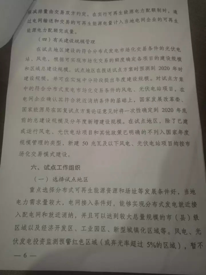 在試點(diǎn)地區(qū)建設(shè)的符合分布式發(fā)電市場化交易條件的光伏電站、風(fēng)電,根據(jù)可實(shí)現(xiàn)市場化交易的配額確定各項(xiàng)目的建設(shè)規(guī)模和區(qū)域總建設(shè)規(guī)模。試點(diǎn)地區(qū)在報(bào)送試點(diǎn)方案時(shí)預(yù)測到2020年是建設(shè)規(guī)模,并可在實(shí)施中分階段提出年度建設(shè)規(guī)模。對試點(diǎn)方案中的符合分布式發(fā)電市場化交易的風(fēng)電、光伏項(xiàng)目。在電網(wǎng)企業(yè)確定其符合就近消納條件的基礎(chǔ)上,國家發(fā)展改革委,國家能源局在回復(fù)試點(diǎn)方案論證意見時(shí)將一次性確定到2020年底前的總建設(shè)規(guī)模及年度新增建設(shè)規(guī)模。在試點(diǎn)地區(qū),除了已建成運(yùn)行風(fēng)電、光伏電站項(xiàng)目和其他政策已明確的不列入國家年度規(guī)模管理的類型,新建50兆瓦及以下風(fēng)電、光伏電站項(xiàng)目均按市場化交易模式建設(shè)。