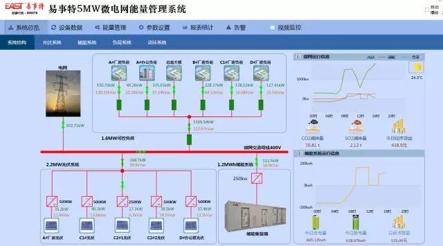 該儲(chǔ)能電站建成投運(yùn),標(biāo)志著國內(nèi)工業(yè)園區(qū)大型光儲(chǔ)微電網(wǎng)典型示范工程誕生,易事特微電網(wǎng)系統(tǒng)走在了行業(yè)的前列。易事特5MW微電網(wǎng)由2.2MW屋頂分布式光伏發(fā)電系統(tǒng)、1.2MWH儲(chǔ)能系統(tǒng)、1.6MW可控負(fù)荷、計(jì)量系統(tǒng)、微電網(wǎng)能量管理系統(tǒng)、智能配電及保護(hù)裝置等組成,可實(shí)現(xiàn)對(duì)光伏及負(fù)荷功率的預(yù)測(cè),儲(chǔ)能系統(tǒng)峰谷時(shí)段削峰填谷、系統(tǒng)經(jīng)濟(jì)優(yōu)化調(diào)度控制等。未來可替代火力發(fā)電或柴油機(jī)發(fā)電等常規(guī)發(fā)電方式,廣泛應(yīng)用于工業(yè)園區(qū)、工廠、商業(yè)圈、海島及不通電地區(qū)的分布式發(fā)電站、智能微電網(wǎng)與高效智能配電網(wǎng)建設(shè)。