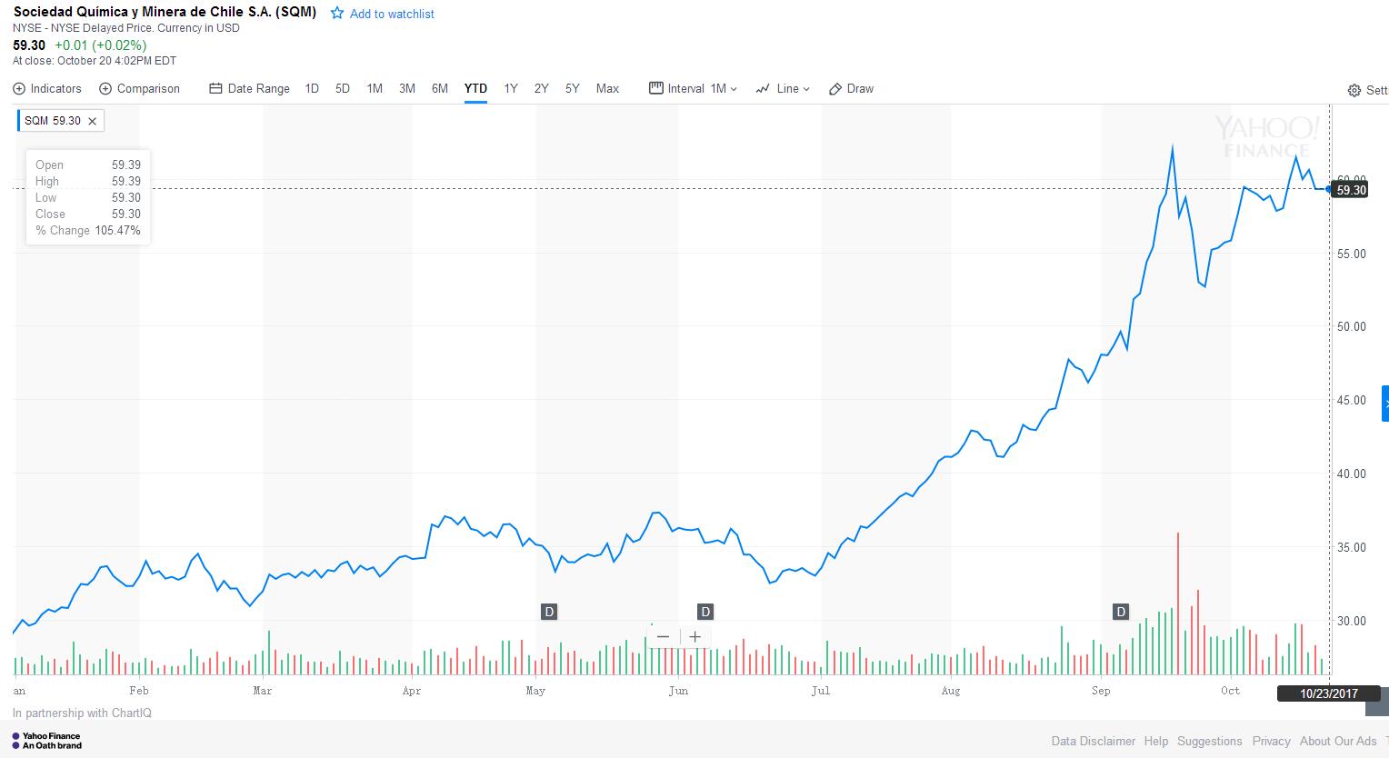 隨著各國大力發(fā)展電動車,以及出臺“禁售燃油車時間表”,鋰的需求大增。今年以來,SQM在紐交所的股價已經上漲約105%。