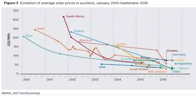光伏成為低價(jià)的能源來源。下圖為不同國家的光伏項(xiàng)目的最低中標(biāo)電價(jià)。