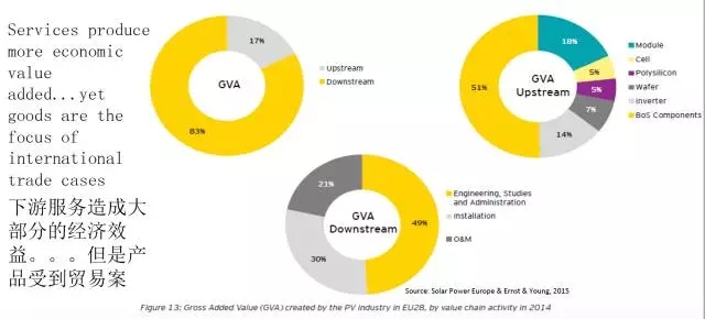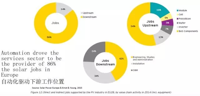 從全球范圍來看,在大多數(shù)的國家, 光伏工作位置在下游。上下游分別提供的工作崗位占比大約為14%和86%。