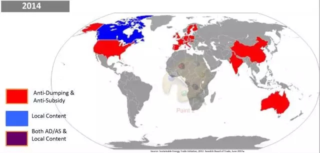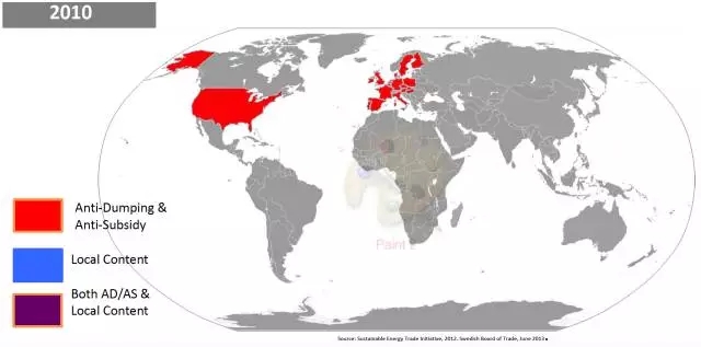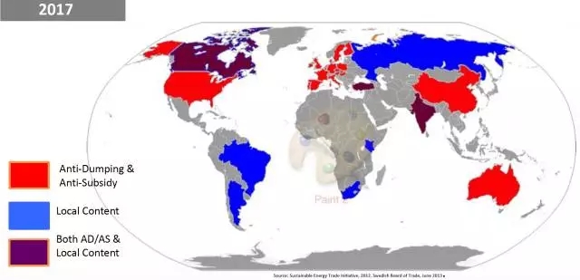 本文統(tǒng)計(jì)了2010、2014、2017年提出雙反、本地產(chǎn)能保護(hù)的國家??梢钥闯?,呈現(xiàn)逐年增加的態(tài)勢(shì)。說明在光伏產(chǎn)業(yè)中,世界范圍內(nèi)的貿(mào)易保護(hù)主義正在增加。