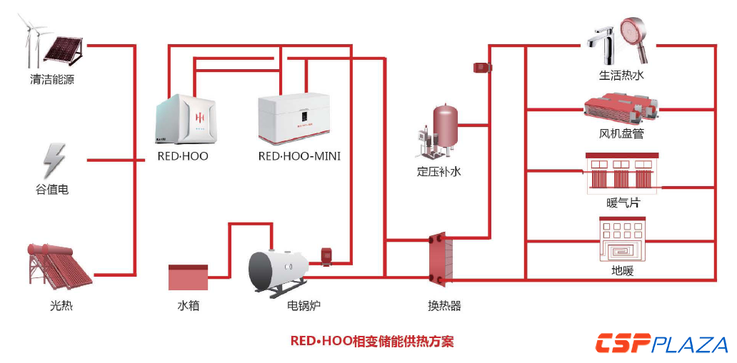 經(jīng)過多年研發(fā)的華厚能源在此領(lǐng)域便憑借其獨(dú)創(chuàng)的相變儲(chǔ)能材料組合,實(shí)現(xiàn)了溫度區(qū)間的全覆蓋,無源冷鏈(<-18℃)、相變蓄冷(8~9℃)、被動(dòng)式節(jié)能建筑(22~29℃)儲(chǔ)能熱泵(45~58℃)、區(qū)域供熱(75~80℃)、集中供熱(150~170℃)、中高溫余熱回收(200℃以上)。通過使用獨(dú)家研發(fā)的相變材料,結(jié)合存儲(chǔ)電鍋爐、燃?xì)忮仩t、熱泵、制冰機(jī)等設(shè)備產(chǎn)生的冷和熱,用于提供生活熱水、冬季采暖和夏季供冷、冷庫(kù)制冷等。截止目前,華厚能源開發(fā)出了RED.HOO、BLUE.HOO、RED.HOO-PLUS等系列相變儲(chǔ)能供熱與蓄冷產(chǎn)品,并推出了與這些系統(tǒng)相配套的云控制系統(tǒng)-CLOUD.HOO以及APP產(chǎn)品-COLOR.HOO。