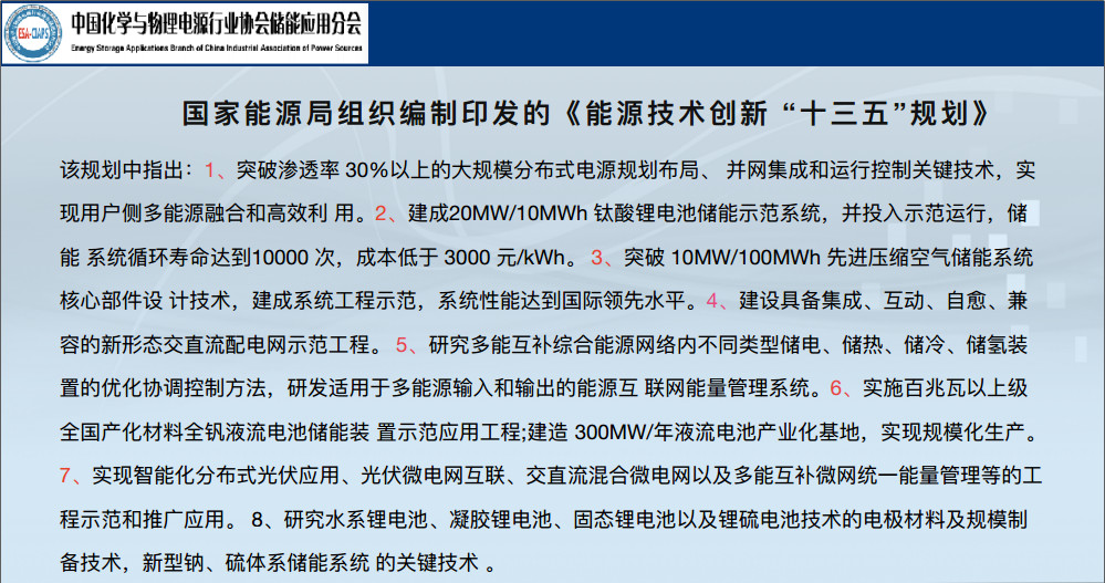 未來(lái)十年的發(fā)展目標(biāo),整個(gè)文件里面都有,我簡(jiǎn)單羅列了一下,2020年實(shí)現(xiàn)儲(chǔ)能示范應(yīng)用向商業(yè)化過(guò)渡,推動(dòng)儲(chǔ)能產(chǎn)業(yè)進(jìn)入規(guī)?;l(fā)展初期階段。要建成一批不同科技路線、不同應(yīng)用場(chǎng)景的示范項(xiàng)目,研發(fā)一批重大關(guān)鍵技術(shù)與核心設(shè)備、初步建立儲(chǔ)能技術(shù)標(biāo)準(zhǔn)體系,形成一批重點(diǎn)技術(shù)規(guī)范和標(biāo)準(zhǔn)。到2025年,儲(chǔ)能產(chǎn)業(yè)呈現(xiàn)規(guī)?;l(fā)展,努力成為支撐未來(lái)電力體系的關(guān)鍵技術(shù),切實(shí)成為推動(dòng)能源變革的重要支撐力量。將在具有自主知識(shí)產(chǎn)權(quán)的關(guān)鍵裝備技術(shù)、應(yīng)用規(guī)模、商業(yè)模式和產(chǎn)業(yè)體系等方面形成較強(qiáng)的國(guó)際競(jìng)爭(zhēng)力。