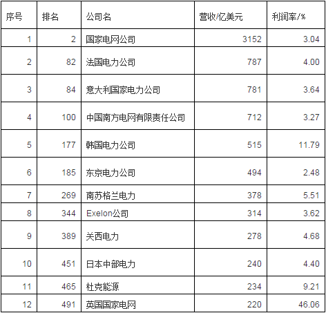 《財(cái)富》2017年世界500強(qiáng)中12家電網(wǎng)企業(yè)共完成營(yíng)收8105億美元,實(shí)現(xiàn)利潤(rùn)431億美元,利潤(rùn)率為5.31%(規(guī)模最小的英國(guó)國(guó)家電網(wǎng)利潤(rùn)應(yīng)該不正常,利潤(rùn)率達(dá)46%位居500強(qiáng)第一,其他11家的平均利潤(rùn)率為4.18%)。國(guó)家電網(wǎng)以3152億美元的營(yíng)收高居500強(qiáng)第2位,利潤(rùn)率為3%,位居500強(qiáng)第286位,在12家電網(wǎng)企業(yè)中居倒數(shù)第2位。南方電網(wǎng)營(yíng)收為712億美元,居500強(qiáng)第100位,居12家電網(wǎng)企業(yè)第4位,利潤(rùn)率為3.3%,位居500強(qiáng)第274位,在12家電網(wǎng)企業(yè)中居倒數(shù)第3位。中國(guó)的2大電網(wǎng)在全球電網(wǎng)企業(yè)中規(guī)模居前,但贏利能力不強(qiáng)。