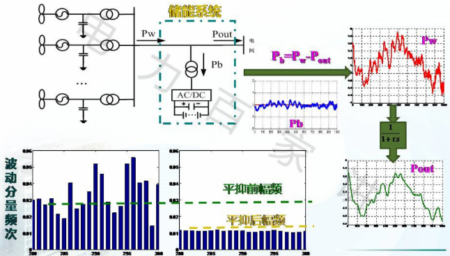 上面這張圖是儲(chǔ)能作用于平抑風(fēng)電功率波動(dòng)的典型作用示意圖,儲(chǔ)能通過DC/AC集中接入風(fēng)電的送出端,借助拓?fù)浣Y(jié)構(gòu)提升電網(wǎng)對(duì)風(fēng)電的消納能力。風(fēng)電輸出是間歇波動(dòng)性的,通過儲(chǔ)能接入電網(wǎng)就會(huì)平抑很多,更受電網(wǎng)歡迎。