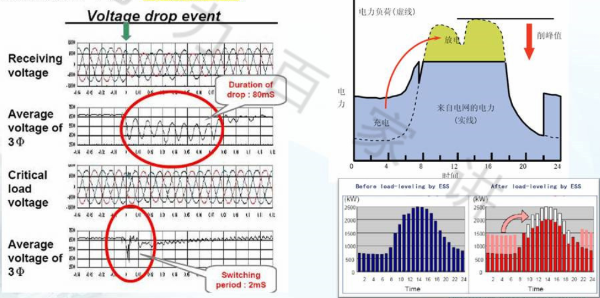上圖體現(xiàn)了儲(chǔ)能在用戶端的一些作用。右邊體現(xiàn)的是儲(chǔ)能在用戶端經(jīng)典的作用,就是減小峰谷差,這也是儲(chǔ)能現(xiàn)階段唯一存在清晰商業(yè)模式的場(chǎng)景,高峰時(shí)刻放電,低谷時(shí)期充電,通過這種手段給用戶帶來商業(yè)價(jià)值,當(dāng)然還有一個(gè)潛在的價(jià)值,削峰填谷,減少對(duì)電網(wǎng)的沖擊。