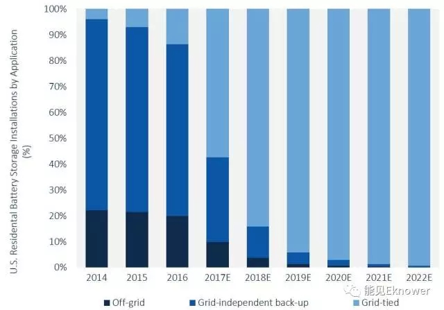 然而,今年GTM Research表示,從2017年開(kāi)始我們將看到這一趨勢(shì)的重大逆轉(zhuǎn)。到2017年底,并網(wǎng)電池系統(tǒng)將占所有系統(tǒng)的57%。到2022年,這個(gè)數(shù)字將會(huì)上升到99%,因?yàn)槊磕甑碾x網(wǎng)電池系統(tǒng)和備用電源都保持相對(duì)平穩(wěn)的態(tài)勢(shì)。