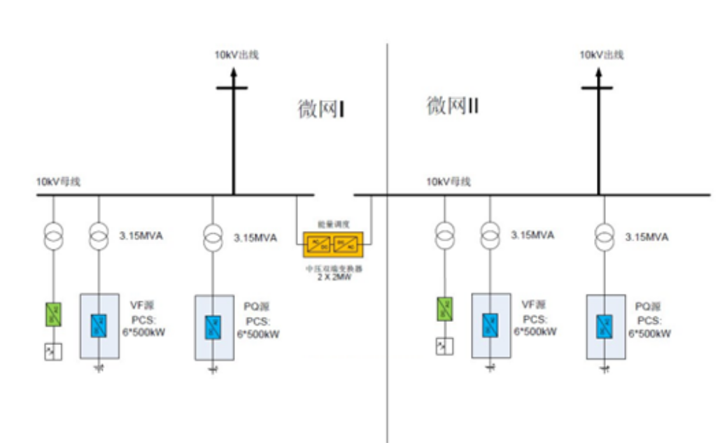 其中,一期項目儲能系統(tǒng)電源容量為9MW,分為兩部分,鋰電池儲能電源功率容量為3MW,鉛炭電池儲能電源功率容量為6MW。其中3MW為系統(tǒng)基礎(chǔ)容量,實現(xiàn)微電網(wǎng)的V/F調(diào)節(jié),6MW作為儲能系統(tǒng)的P/Q源,主要實現(xiàn)對系統(tǒng)的供電,每3MW儲能逆變器交流側(cè)連接后經(jīng)一臺3150kVA/10/0.4升壓變壓器接入開關(guān)站子網(wǎng)10kV母線。